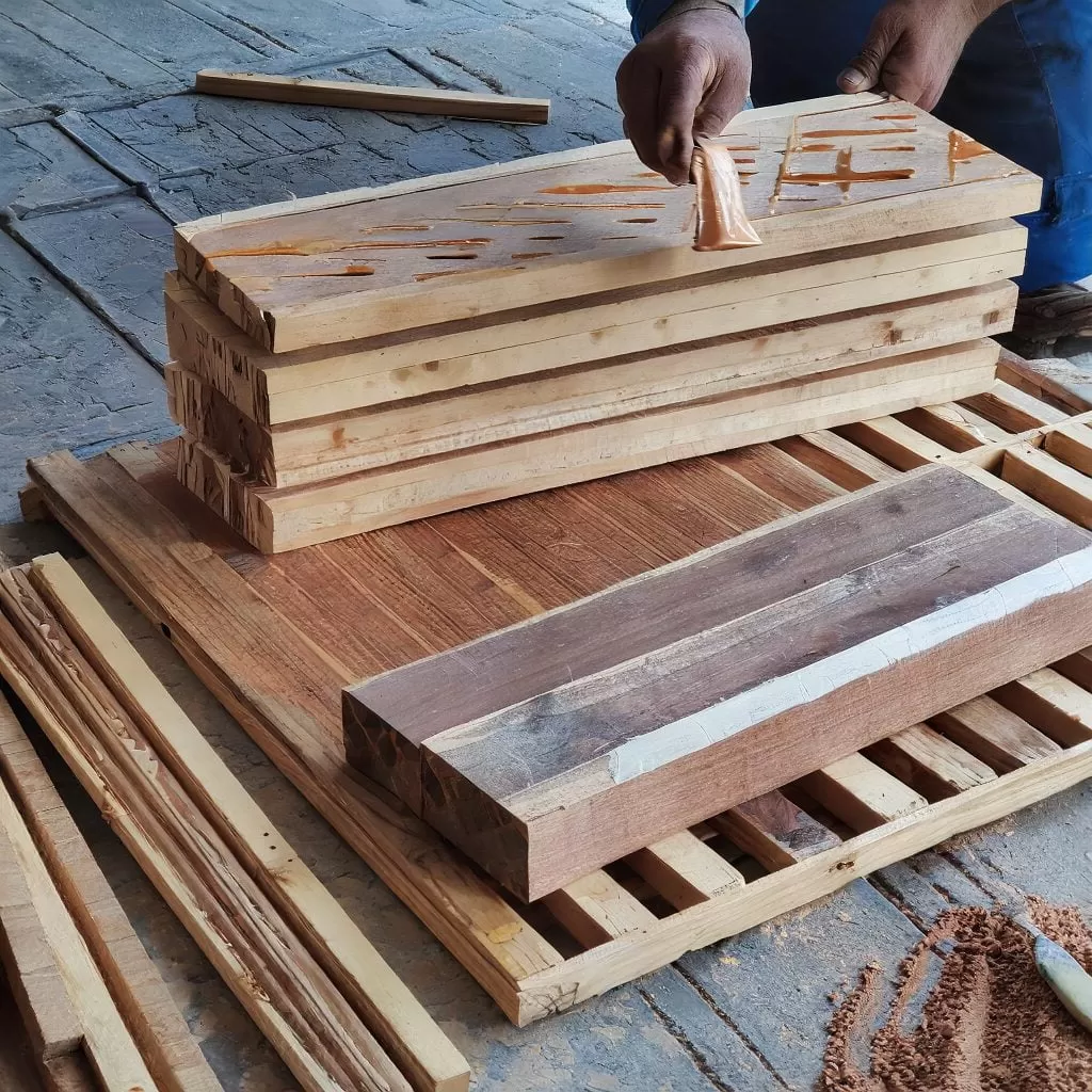 La colle est essentielle pour assembler les différentes pièces de bois. Dans la création de motifs complexes, comme les moucharabiehs (des claustras en bois), la colle assure une jonction solide et durable entre les pièces, sans altérer l’esthétique.