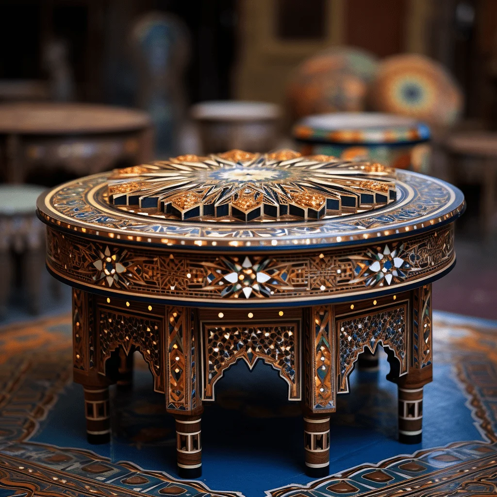 À Marrakech, la fabrication de tables en marqueterie illustre l’utilisation de la colle pour fixer des pièces de bois de différentes essences et couleurs afin de créer des motifs complexes. Ces tables, souvent ornées de motifs inspirés de l’architecture islamique, démontrent l’habileté des artisans à utiliser la colle de manière à ce que les joints soient pratiquement invisibles, tout en assurant une surface lisse et homogène.